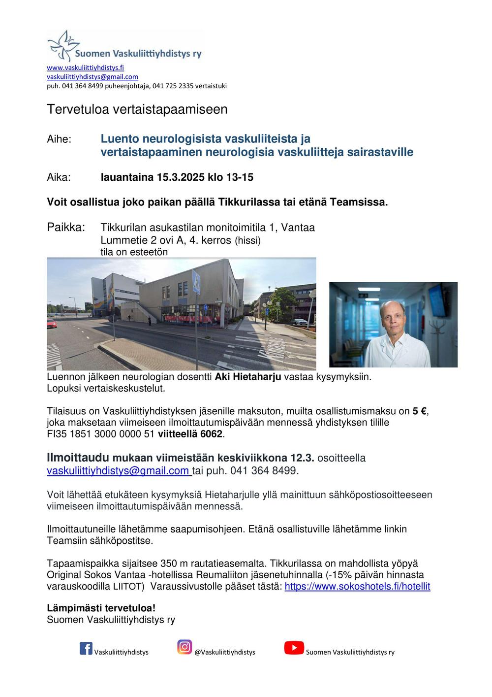 Luento neurologisista vaskuliiteista ja vertaistapaaminen neurologisia vaskuliitteja sairastaville