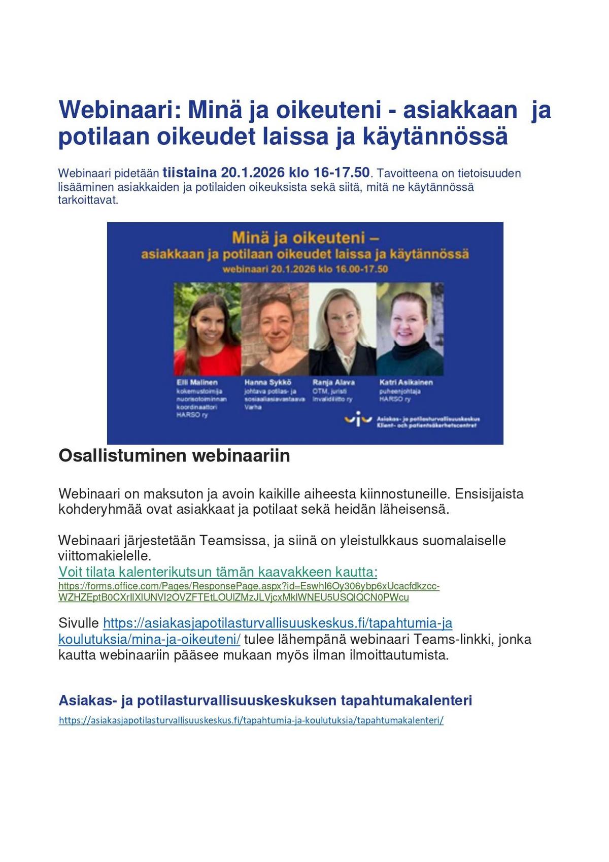 Sivulle https://asiakasjapotilasturvallisuuskeskus.fi/tapahtumia-jakoulutuksia/mina-ja-oikeuteni/ tulee lähempänä webinaari Teams-linkki, jonkakautta webinaariin pääsee mukaan myös ilman ilmoittautumista.