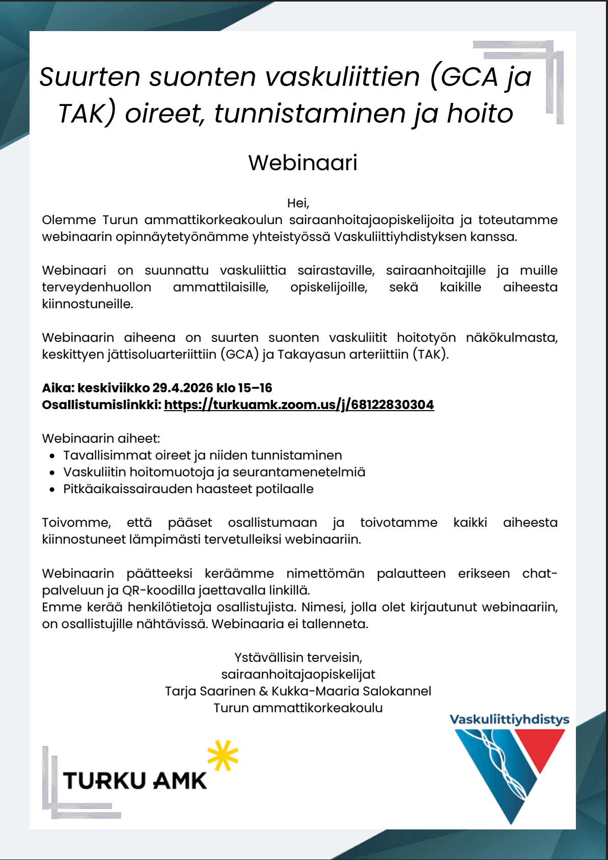 Webinaari: Suurten suonten vaskuliittien (GCA ja TAK) oireet, tunnistaminen ja hoito (Turun AMK)