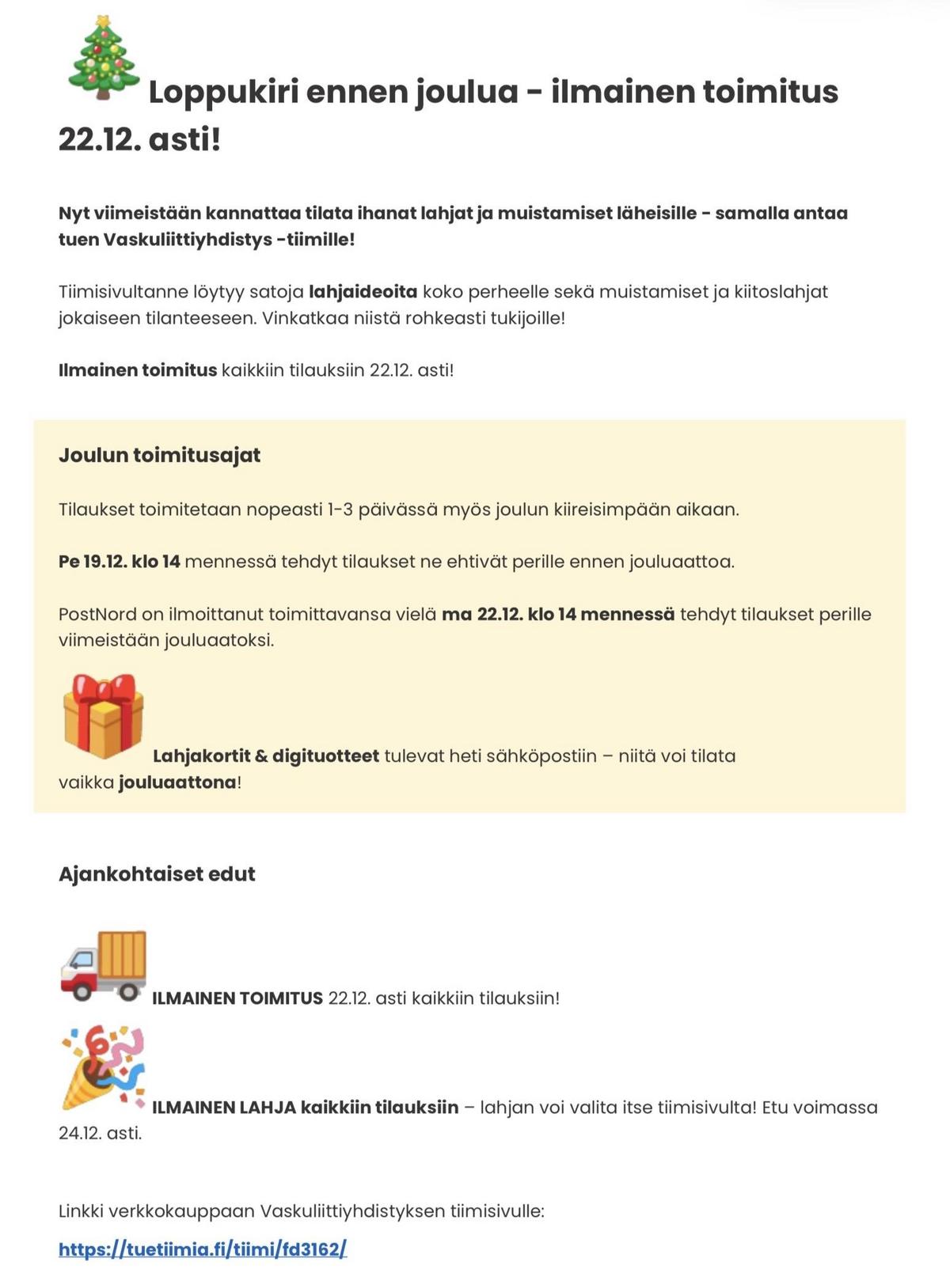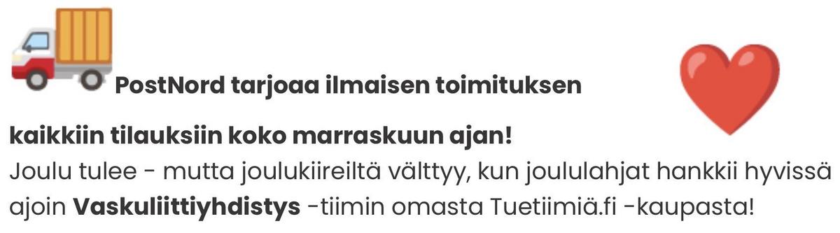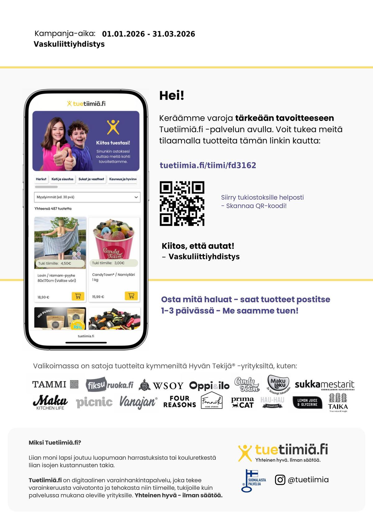Me Vaskuliittiyhdistyksessä olisimme tosi kiitollisia, jos tukisit meidän varainhankintaa tilaamalla jotakin meidän TueTiimiä-verkkokaupasta: https://tuetiimia.fi/tiimi/fd3162