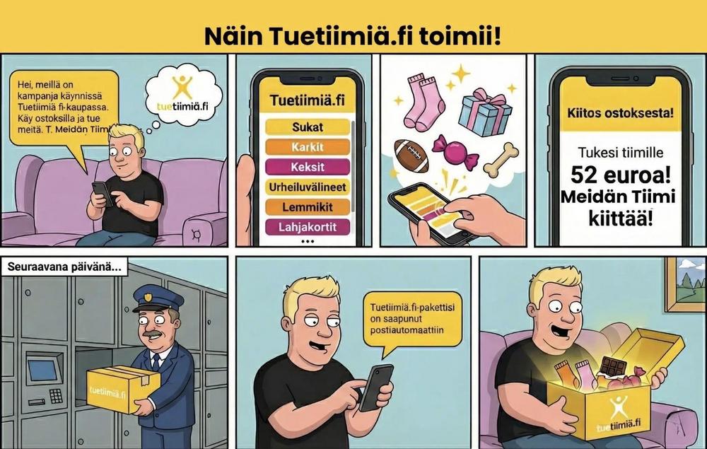 Käy tutustumassa TueTiimiä -kaupan valikoimaan. Tuotteita on laidasta laitaan, tilaa mitä tahansa itselle tai vaikka lahjaksi. Jokaisesta tilatusta tuotteesta yhdistys saa pienen osuuden, joka näkyy kaupassa kunkin tuotteen kohdalla.