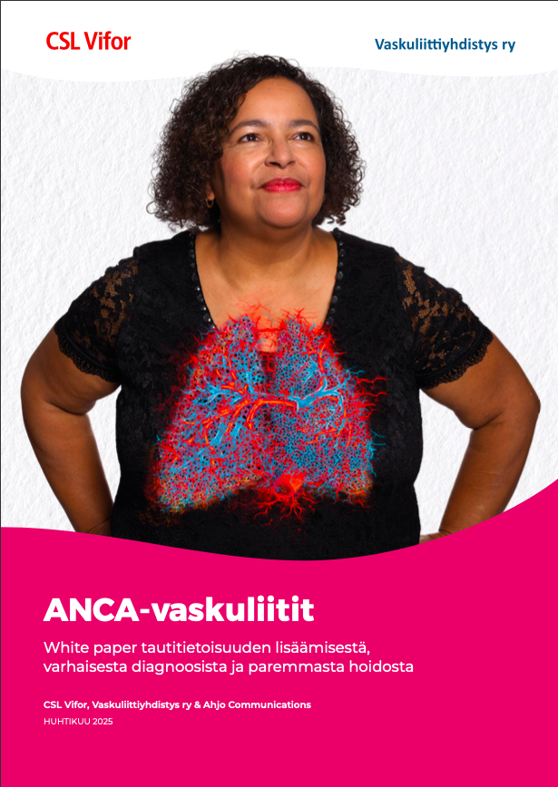 White paper on suunnattu päättäjille ja kerää yhteen perustietoa ANCA-vaskuliiteista, suomalaisten ANCA-vaskuliitteja sairastavien potilaiden kokemuksia sairautensa hoidosta ja kahden erikoislääkärin näkymykset hoitoon ja sen haasteisiin liittyen. Lopuksi esitetään, millä keinoilla haasteisiin voitaisiin puuttua ja tilannetta parantaa.